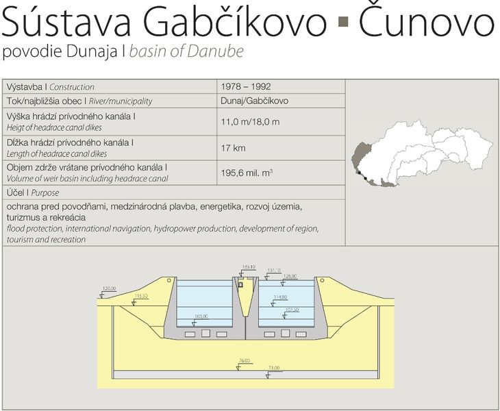 Objekty stupňa Čunovo sú: odberný objekt do Mošonského ramena, hať v inundácii, vodná elektráreň, stredná hať, plavebná komora, areál vodných športov, prehradenie koryta Dunaja a hať na obtoku. Prívodný kanál spolu so stupňom Čunovo sústreďuje hydraulický spád, privádza vodu ku stupňu Gabčíkovo, súčasne plní funkciu plavebnej dráhy a podieľa sa na odvádzaní vôd v prípade povodňových prietokov v Dunaji. Kanál je umiestnený nad terénom, má dĺžku 17 km, jeho šírka je premenlivá od 350 do 734 m. Stupeň Gabčíkovo sa skladá z vodnej elektrárne a plavebných komôr. Vyznačuje sa impozantným riešením zakladania týchto objektov v mimoriadne zložitých geologických podmienkach, pri výskyte priepustných štrkov do hĺbky viac ako 300 m. Tesnené stavebné jamy, ktorých dimenzie cca 400 m x 200 m do hĺbky až 60 m sa radia medzi najväčšie objekty zakladania vodných stavieb na svete.