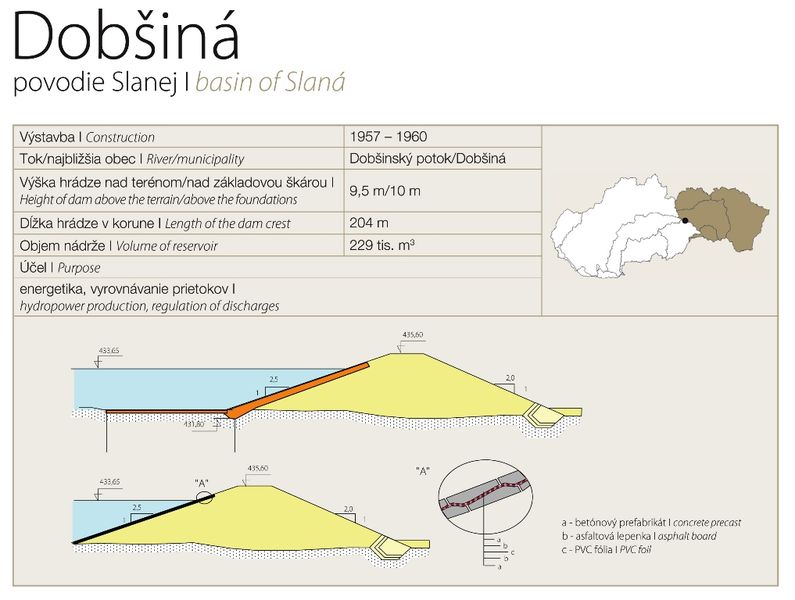 Nádrž Dobšiná bola vytvorená neskôr, v rokoch 1957 – 1960, ako vyrovnávacia nádrž pod Vlčou dolinou, aby eliminovala rozkolísanosť prietokov v Dobšinskom potoku, spôsobených výrobou špičkovej elektrickej energie. Nádrž je vytvorená nízkou sypanou priehradou so svahovým (plášťovým) tesnením. Toto v ľavostrannej časti hrádze tvorí stabilizovaná zemina, v pravej časti fólia PVC. Napriek tomu, že sa jedná o vodné dielo, ktoré svojimi parametrami nespadá do registra ICOLD, je v ňom zaradené. Zásluhu na tom má práve skutočnosť, že na tejto priehrade bola syntetická fólia ako tesniaci prvok v priehradnom staviteľstve použitá po prvý krát na svete.