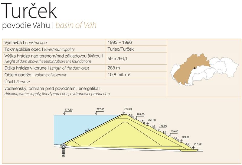 Výška priehrady nad terénom je 59 m. Sklon návodného svahu je 1 : 2. Sklon vzdušného svahu je 1 : 1,65. Podložie priehrady je utesnené injekčnou clonou premenlivej hĺbky, od 30 do 60 m. Prístup do združeného funkčného objektu je realizovaný komunikačným tunelom, razeným v ľavom údolnom svahu. V slovenských podmienkach bolo asfaltobetónové plášťové tesnenie pre potreby vodárenskej nádrže použité prvýkrát. Pri výstavbe vodného diela Turček bolo treba riešiť mnoho problémov, súvisiacich s ochranou životného prostredia, ohrozených druhov flóry i fauny.